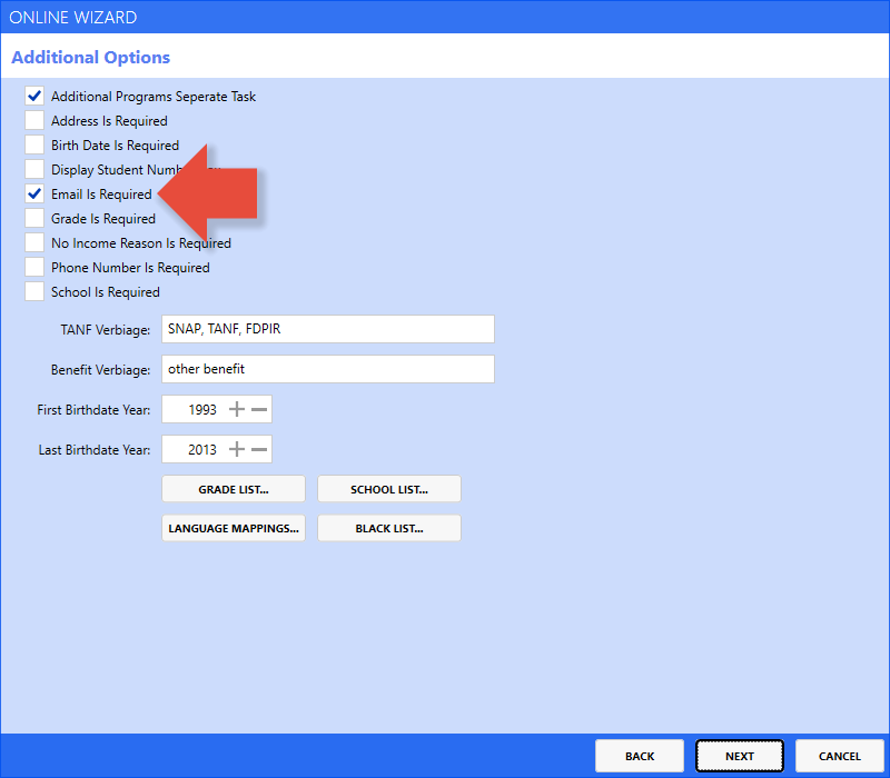 If you would like to require a guardian email address for all online applications, check the box for "Email is Required" on the "Additional Options" screen.