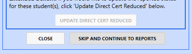 the Direct Certified Update, click Skip “SKIP AND CONTINUE TO REPORTS”.