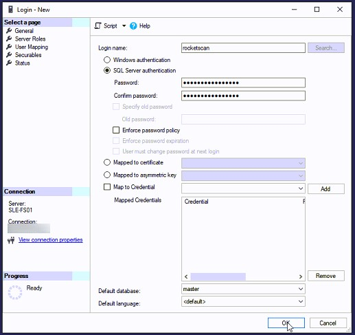 RocketSCAN database with "dbo" as the Default Schema. Select