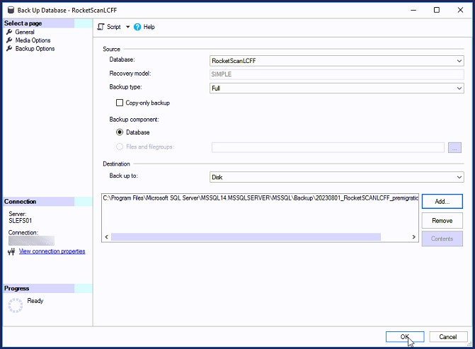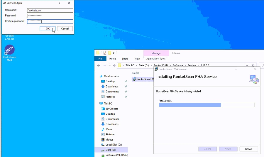 After the database connection is established, install the RocketSCAN FMA Service on the new server.
