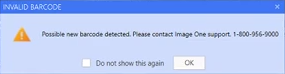A red thumbnail is usually preceded by a warning prompt: "possible new barcode detected." You will need to contact Image One support to correct the 'invalid barcode', but it is recommended that you first finish the scanning process and save the batch of good scans. If you are prompted with an invalid barcode, do the following: