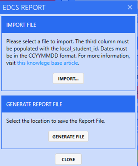 After the import file has been imported, click “GENERATE FILE” to create the EDCS Report.