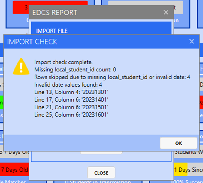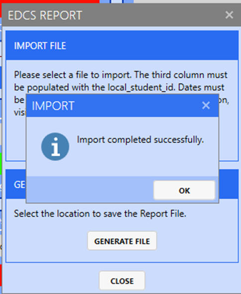 Note: The imported data is stored in a designated table within the RocketScan database. On subsequent file imports, the table is first cleared before the data from the new import file is inserted into the table. When generating the EDCS report, it will use only the student numbers provided in the most recent imported file.
