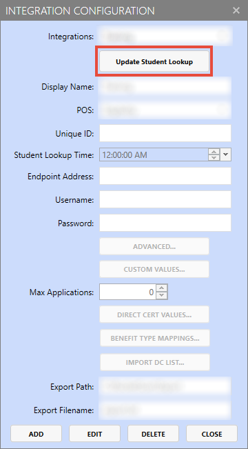 If your system does not have this button, you can go to Administration > Integrations then click on the button that says “update student lookup”. Which finished, close the Integration Configuration window.