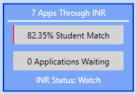 The next box is the INR Status and it indicates how many scanned applications you have processed. INR, or Intelligent Name Recognition, is the part of Rocketscan that attempts to interpret the handwriting on applications. The top bar indicates what percentage of students were matched through scanning, while the second bar indicates how many applications are currently awaiting INR (in other words: have been scanned, but have not yet gone into Validation).