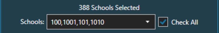 Use the Schools dropdown to select the school or schools you would like to use to generate the report. Check the box(es) of the school numbers and/or names for the report.
