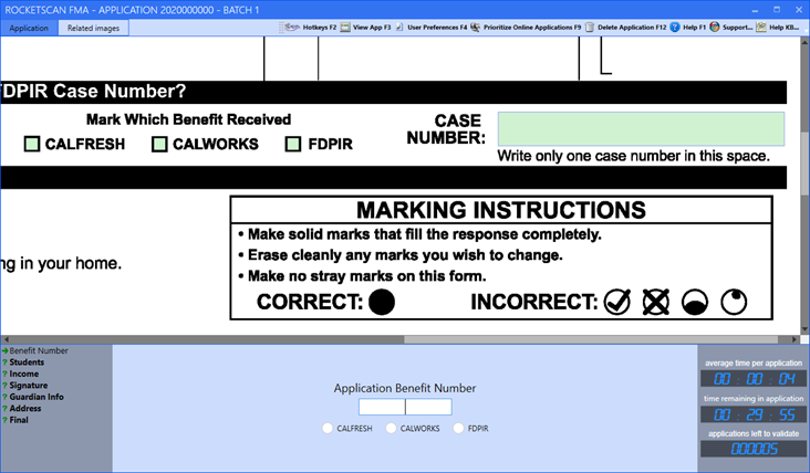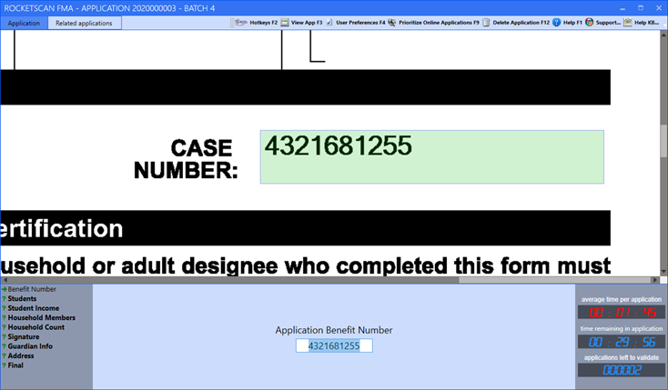 At the top left area of the Validation window are 2 tabs: Application and Related images . The Application tab displays the image of the application that is being validated. The image is zoomed in to the section of the application that is being validated in the Data Entry Frame. For example: If the Data Entry Frame is asking the user to verify the applicant's benefit number, then the Application Image Frame will be zoomed in to the part of the application where it asks for the applicant's benefit number. The Related images tab displays supporting documents (if they exist) and images of previous applications (if they exist and have been processed in RocketScan) for students known to be on the current application.