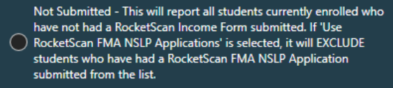 For the ‘Not Submitted’ Report if you have checked the “Use Rocketscan FMA NSLP Applications” and the students have a Meal Application that was processed through Rocketscan on file those students will not be included on this report. To get a complete report of students who have Not Submitted an Income Form please uncheck “Use Rocketscan FMA NSLP Applications”.