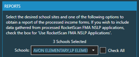 To include the statuses from Rocketscan FMA NSLP applications be sure to check the box prior to generating the report.