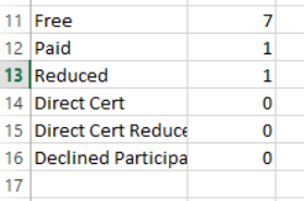 The Totals for Free, Paid, Reduced, Direct Cert, Direct Cert Reduced and Declined Participation will be displayed at the bottom of the report.